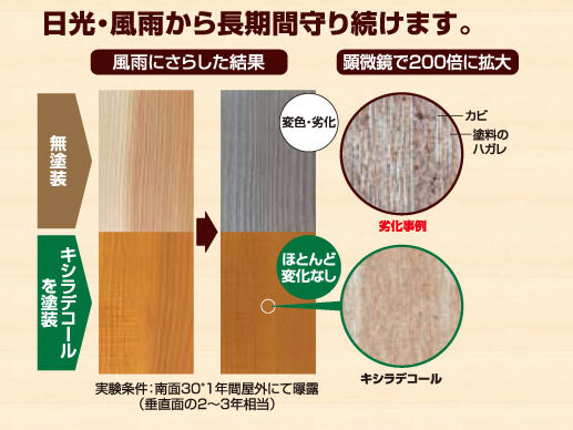木材は耐候性木材保護塗料キシラデコールを使用することで、木材でありながら高い耐候性を実現しました。雨がかりが多い場所でも安心してお使いいただけます。